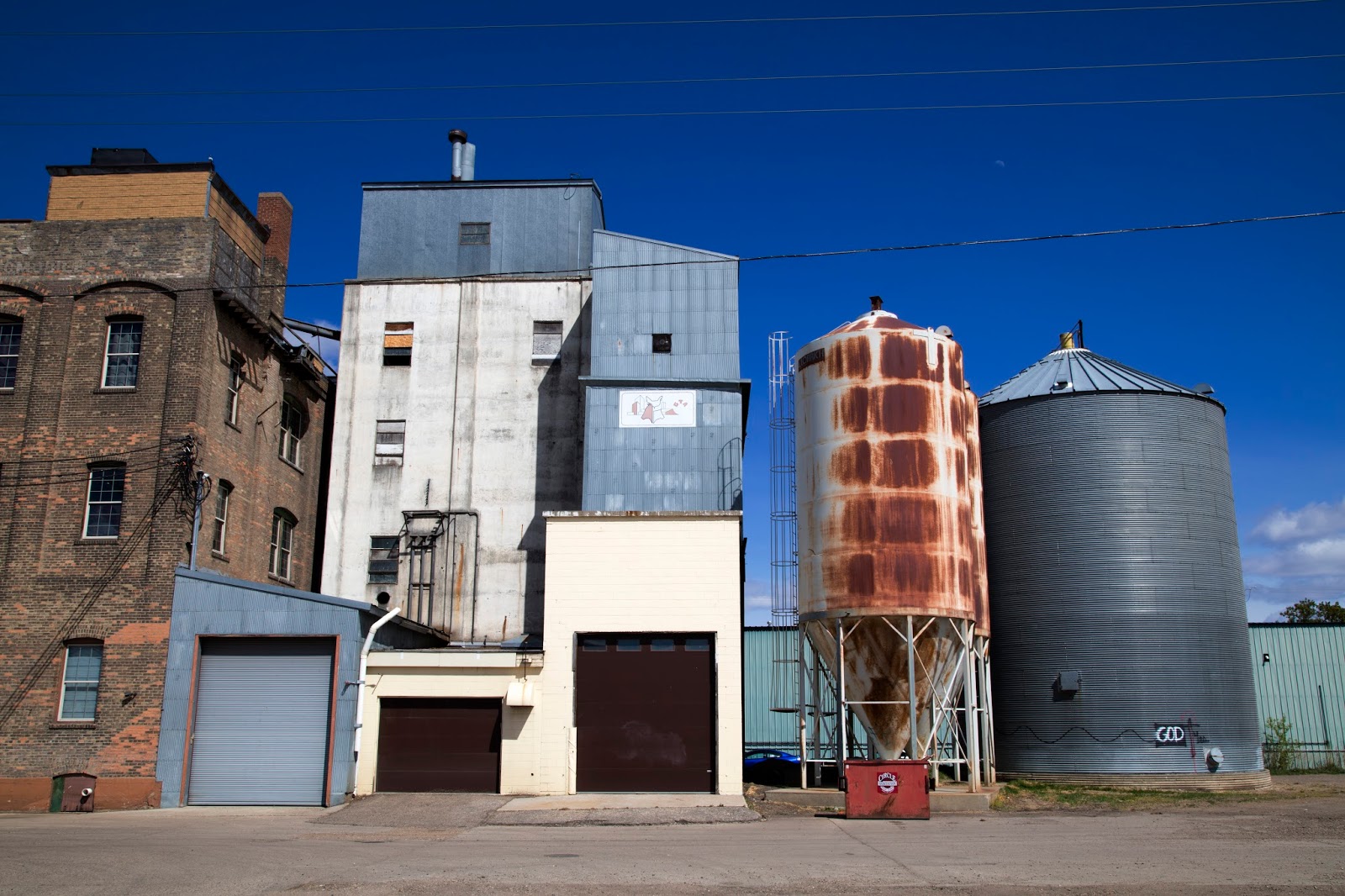 Image #2 from my trip to Minot, ND. I was walking around downtown Minot on the return from visiting rural North Dakota when I saw these grain silos. It was a sunny day, mid-day but I thought the blue sky worked as a nice background for the geometric and boldly colored structures. I tried to get a straight on perspective to emphasize the texture and lines in these rural buildings against that blue sky.