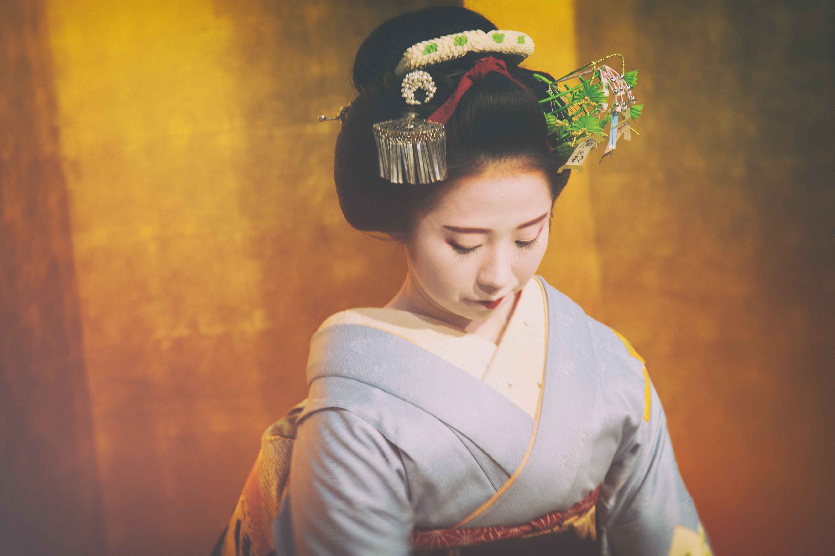 - “Downward Facing Geisha,” this one from the tea house session with the Maiko. Here she’s before the performance, speaking to us through a translator. She did speak a little English actually as, when I told her I was from Texas, she replied, “Ah, TEXAS!” Everybody knows Texas somehow and everybody knows Geisha too, so we had some common ground there.