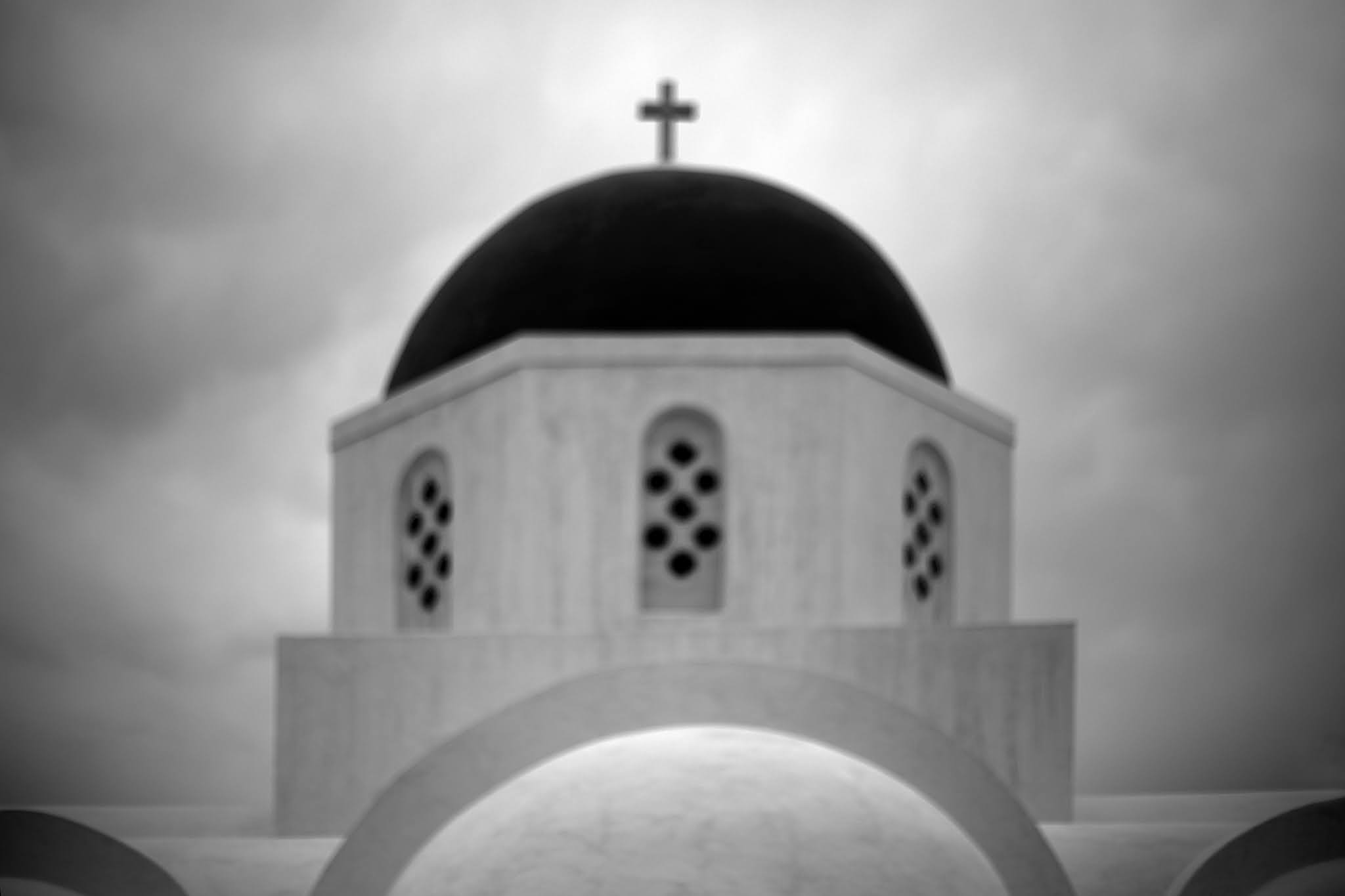 I was lucky enough while visiting the city of Oia that I found a quiet corner. Some out of the way, off the beaten path spot, somehow, I just fell upon it. I made my way there by accident but wound up staying for a bit. After I found this spot, I saw the church there. The light was wonderful that day, storm clouds off on the horizon but an interesting sky. A sky with clouds and shafts of light bursting through. I love that kind of light, as it gives the sky a certain luminosity. The soft clouds, the wonderful light, the subtle curves and the brilliant geometry all combined to make Greek architecture very memorable for me that day.